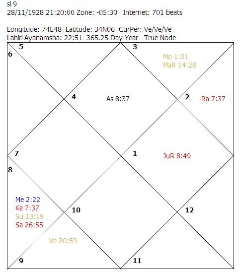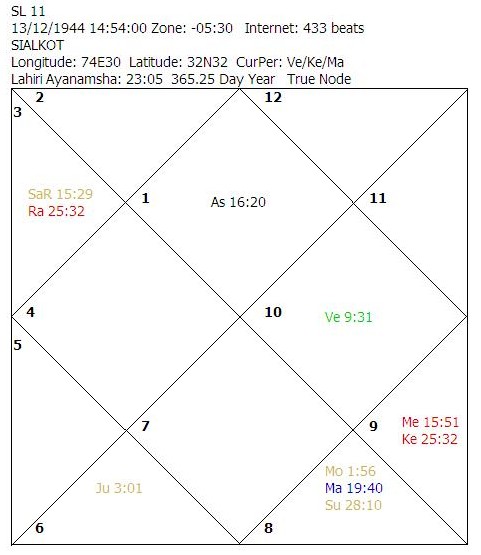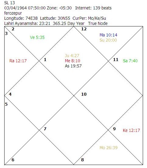 The sign Aries rises in the ascendant which means that besides Rahu and Ketu, Mercury also becomes a functional malefic planet. Mars and Mercury become prime indicators of health while the Moon becomes the secondary indicator for heart condition. Mercury is weak as its dispositor is weak. Mars is weak as it is combust and badly placed. Mercury becomes additionally weak by being closely afflicted by Ketu. The Sun, being a primary significator of the heart, is weak as it is badly placed. The Moon, being a secondary indicator and secondary significator of the heart's condition, is very weak as it is badly placed, debilitated and in old-age. The several weaknesses and afflictions make the native vulnerable to heart problems during transit afflictions in the sub-periods of indicator and significator planets. The native suffered from heart disease and had to undergo an open heart surgery at the young age of 27 years, in the sub-period of Mercury in the main period of Venus.