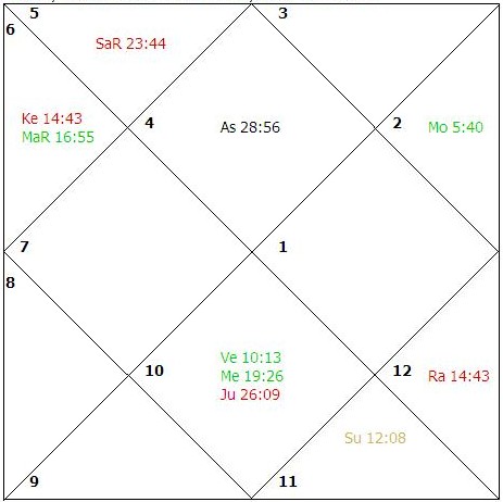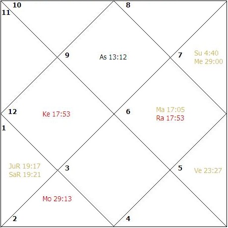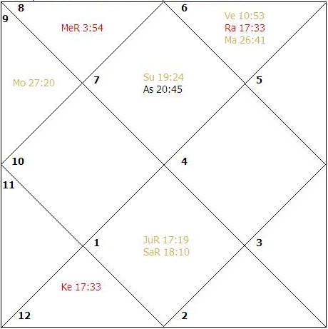 The sign Libra rises in the ascendant and Mercury, Rahu and Ketu become functional malefic planets. The Sun, Venus and Saturn are in their signs of debilitation. As per the classical commentaries, the debilitation of all these three planets stands cancelled due to the placement of Venus and Mars in an angular house from the Moon and the Sun occupying a house, angular to the ascendant. Birth: