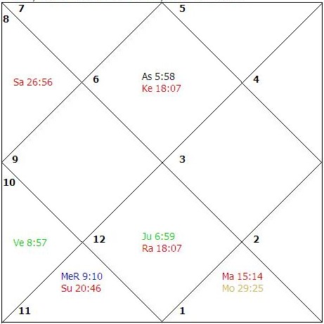 The sign Pisces rises in the ascendant and the Sun, Venus, Saturn, Rahu and Ketu become functional malefic planets. Jupiter is utterly weak as it is combust, in the state of infancy and is also in its sign of debilitation. Jupiter is closely conjunct with the lord of the sixth house and is severely afflicted by the exact aspect of Rahu. The Sun becomes the prime significator of health in this case. The significator of longevity, Venus, is weak as it is badly placed in the chart. Mars is weak as it is badly placed in the chart and is closely afflicted. The Moon is weak as it is in the state of combustion and its dispositor is utterly weak. Saturn ruling the twelfth house is in exact conjunction with Ketu. Mercury is weak due to the utter weakness of its dispositor. There are exact afflictions and all the functional benefic planets are weak. The child had frequent ill health during his childhood retarding his educational pursuits. This later on culminated in restricted avenues for his profession. The success in his professional life will be eluding. Whenever the lord of the tenth house in badly weak and afflicted the life span of the native is also short. The lord of the eighth and twelfth both signifying longevity in addition to the life giving planets in this case are weak. Birth: March 5, 1987, 1929 hrs.