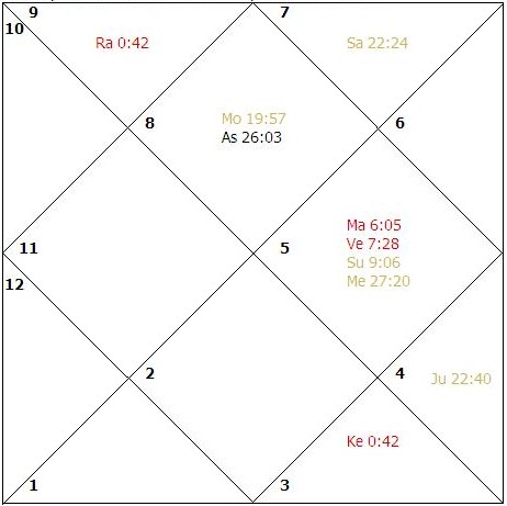 The sign Virgo rises in the ascendant and Saturn, Mars, Sun, Rahu and Ketu are the functional malefic planets. The lord of the ascendant, Mercury is weak as it is combust and located in the sixth house. Mercury primarily rules health and longevity. The Moon is weak as it is badly placed in the chart and is in old-age. The Sun ruling the twelfth house and becoming significator for longevity is badly placed. Mars is in its own sign in the eighth house. Both Jupiter and Venus are strong in the chart. In ashthamsa (D-VIII), Ketu and Rahu occupy the fourth house. The child died at the age of a few months in the sub-period of Rahu and the main period of the badly placed Sun during the stationary transit influence of Rahu/Ketu axis operating at birth due to the weakness of a significator of longevity in the child's infancy. Birth: August 26, 1955,1420.