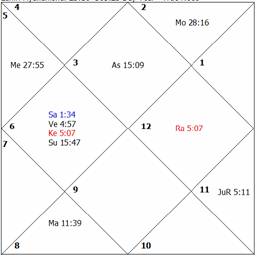 its sign of debilitation and is in extreme old age. The Sun occupies the twelfth house in D-IV. The significators, Mars and Venus, are in the