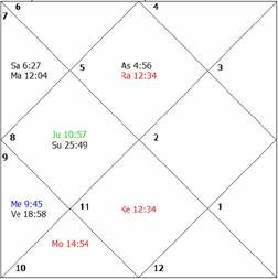 of the most malefic planet, the Moon, and Ketu. Mars and exalted Mercury are combust and weak. The lord of the ascendant of D-IV, Jupiter, becomes