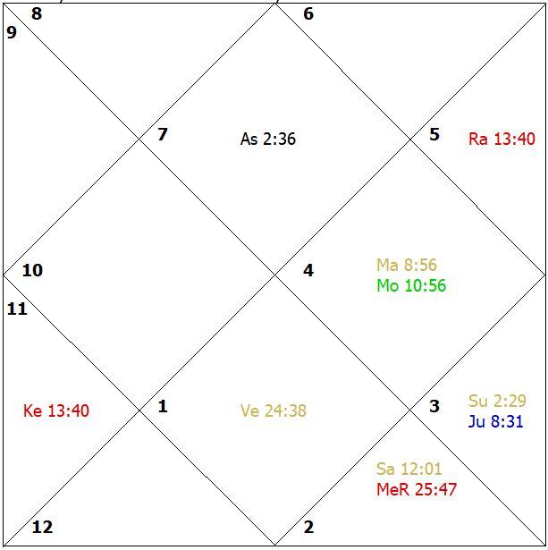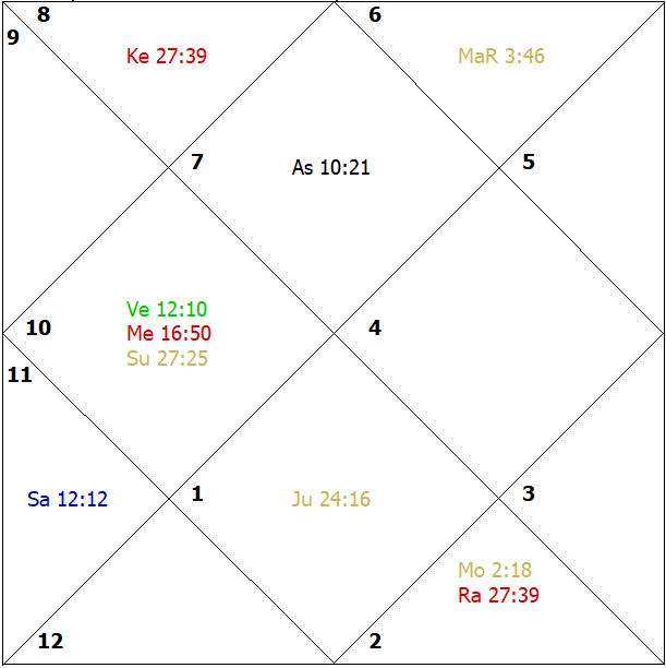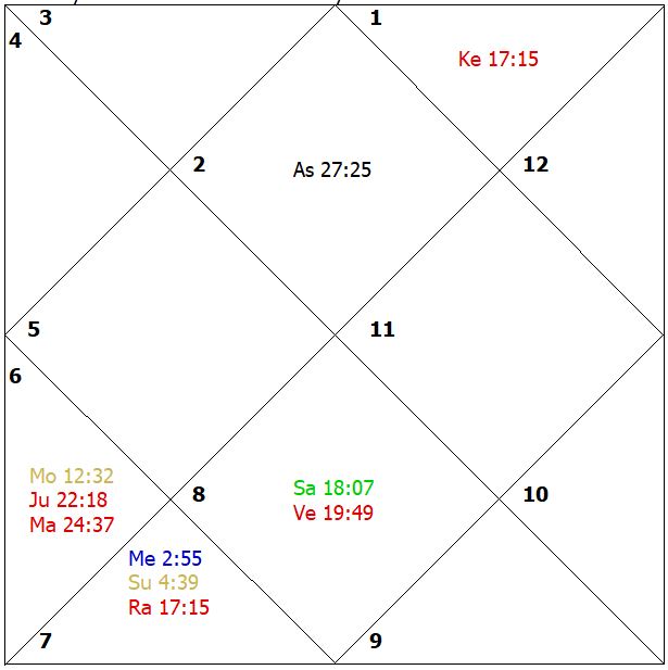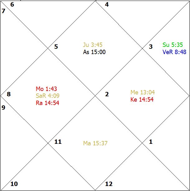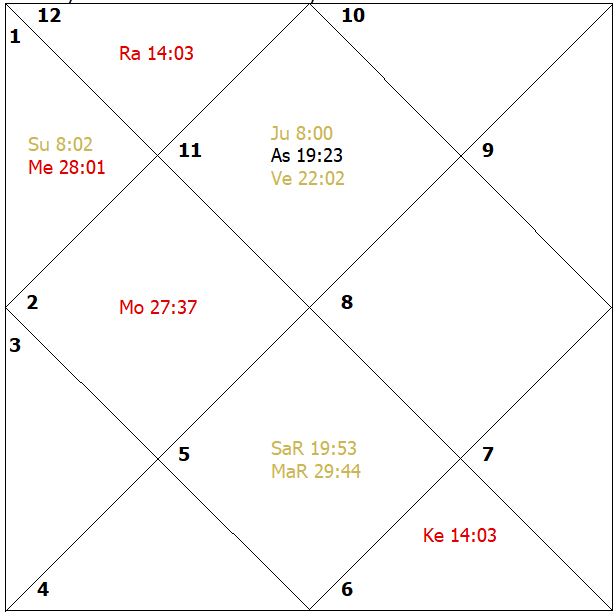 In this nativity, besides the dhanakarakas, Saturn, the Moon, Jupiter and Mercury become the significators of financial resources. Saturn is strong in this chart. The Sun is in its sign of debilitation and is badly placed in the sixth house ruling debts, disputes and diseases. The weak combust Mercury is also placed in the sixth house. The close influence of the functional malefic Mars on the most effective point of the eleventh house caused losses and obstructions in the sources of income. The close influence of the functional malefic Mars, by way of conjunction with Jupiter, the planet ruling inheritance, caused enormous loss of wealth to the father. The placement of the Moon in the fifth house indicates some gains in life through the entrepreneurial ventures. However, the Moon, as a significator, indicates lots of changes in life, and weakness of dispositor of the Moon in this case induced frequent changes in the professional pursuits of this native. The use of the propitiatory astral remedies for the functional malefics and use of a Kavach for the weak functional benefic planets in an auspicious time were suggested for improvements in the matter of health and financial resources.