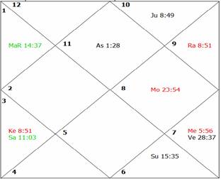 of both the rasi chart and decante, being lord of the ninth house of decante. Mars when weak indicates lack of courage and