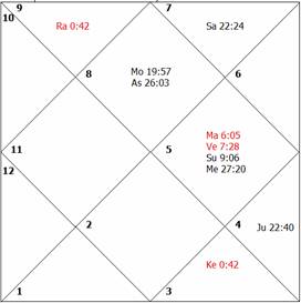 occupied by a combust Mars and debilitated Sun, the lord of the fifth house. The significator for husband, Jupiter,