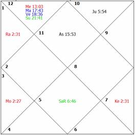 and afflicts the fifth and eleventh houses. The debilitated Jupiter ruling the