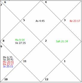 is in the fifth house in its sign of debilitation and is weak. The fourth house is occupied by Rahu and