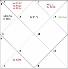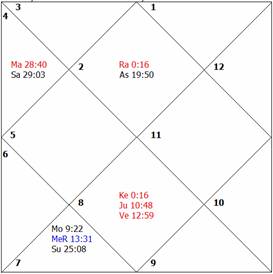 eleventh house, the Moon, is badly placed in the chart and is debilitated in