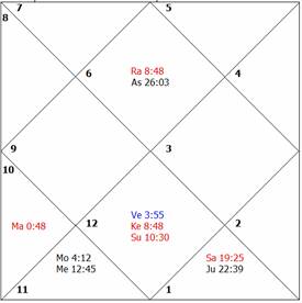 house, becoming prime determinants of health, are weak due to combustion. The twelfth house is occupied by Mars, Venus