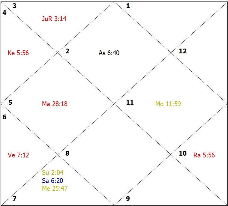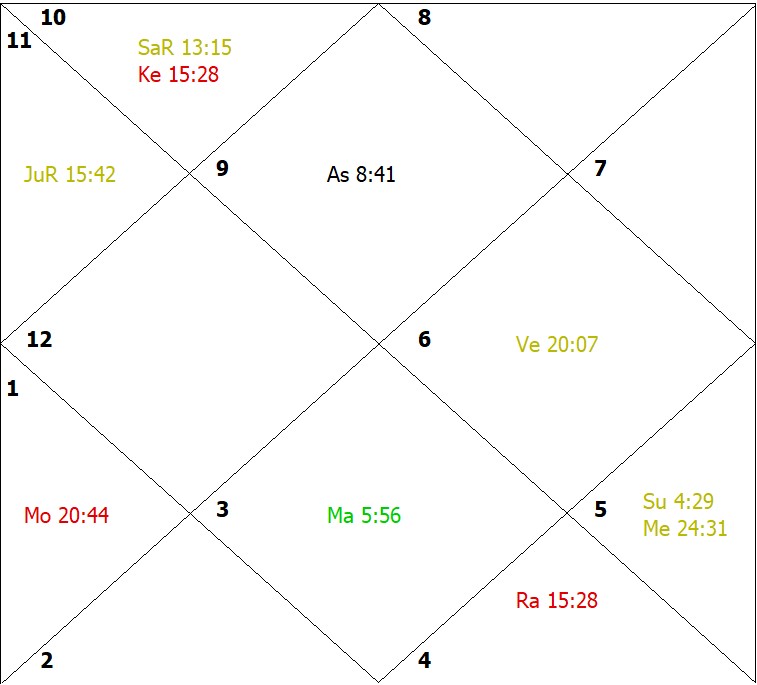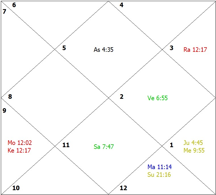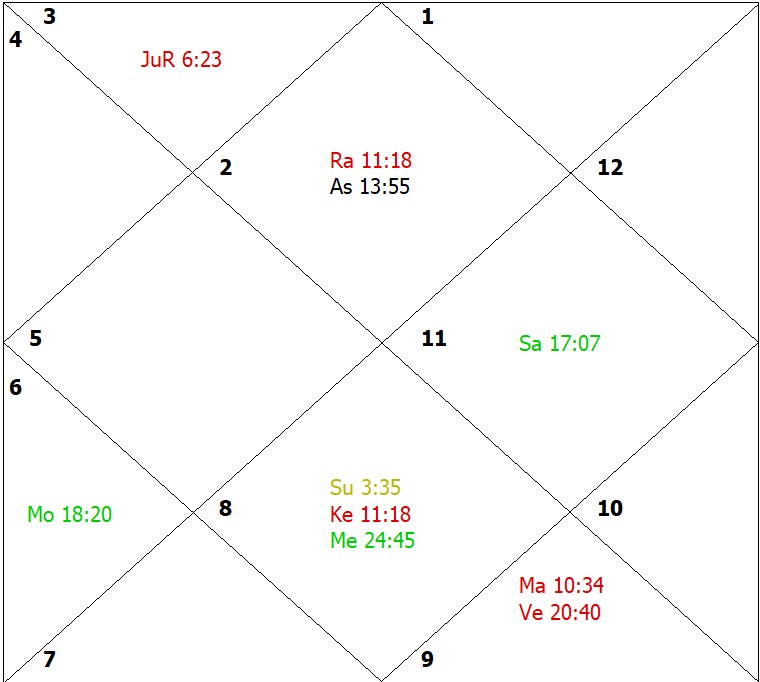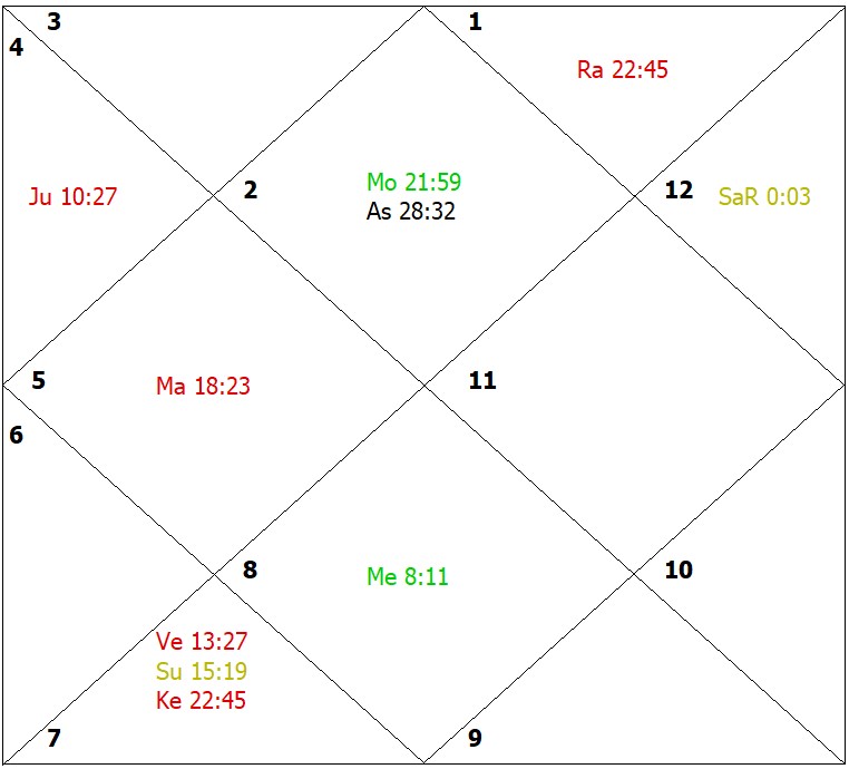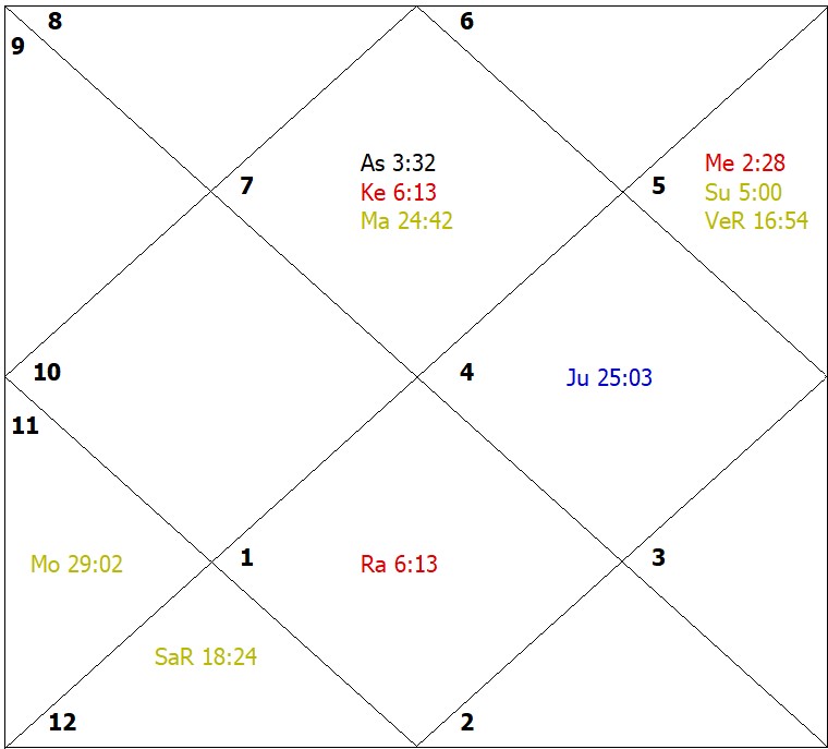 Mercury, the primary significator for progeny matters, is very weak as the most effective point of the fifth house is closely afflicted by Venus and Rahu, and it is badly placed, in old age, and weakly disposed. The Sun is very weak as it is closely afflicted by the most malefic planet, Jupiter, besides being in infancy, debilitated in rasi and navamsa, and badly placed. Jupiter, being in infancy, also afflicts the most effective point of the second house. The afflictions to the second house and the Sun delayed marriage which could only be solemnized at the age of 37 years. Thereafter, up to a period of five years, there was no child. The native was running the sub-period of Rahu in the main period of Saturn when he visited India and sought astral remedies for peace and prosperity in life. The afflictions to the Sun and the second house deny good status to the native.