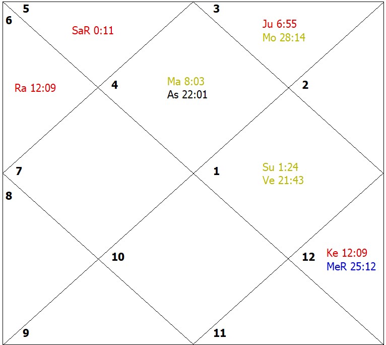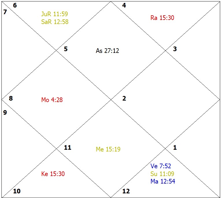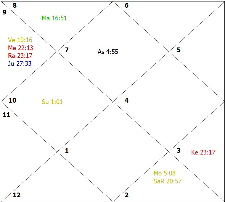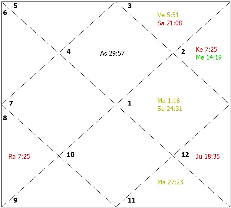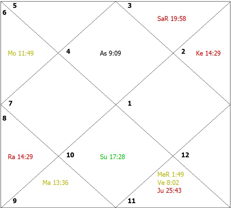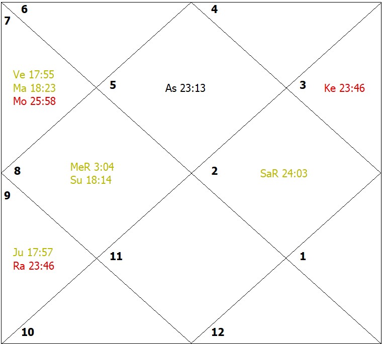 The Moon is in its sign of debilitation. The fifth lord, Jupiter, along with Saturn, are under the close aspect of Ketu from the sixth house. The badly placed Sun and Mars are under the close aspect of Rahu from the twelfth house. Although Mercury is apparently well placed and unafflicted, the sub-period of Mercury was of little help due to the affliction of its dispositor. As soon as the sub-period of Mars in the dasa of Saturn started there were problems to the father in his business and from the Government. The circumstances at home created tension for the native. The onset of the sub-period of Rahu in the dasa of Saturn and the affliction of the Sun by Rahu triggered acute tension for the native that involved his father as well, as the Sun is a natural significator of father. In August 1994, the astral remedies were sought when the natal afflictions and the long duration were explained to the father. Though the astral remedies were started, to cut short the duration more stress was placed by the father of the native on the psychiatric treatment in lieu of the astral remedies. The prolonged psychiatric treatment proved to be of no help and the native's father returned to astral remedies. The performance of astral remedies helped in steering the native clear of the problem. The child is now leading a normal life and participating in the family business. The problem, however, took its toll on the child's studies.