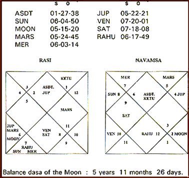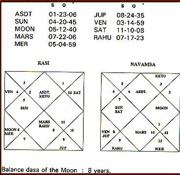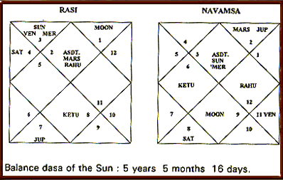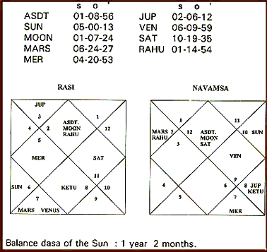 The Moon ruling the third house of leadership and vision is strongly placed in the second house ruling status. The Sun occupies the fourth house, which has its own mooltrikona sign, and is very close to the most effective point of the fourth house. The Sun is weak as it is afflicted by the exact aspect of Rahu from the twelfth house. Jupiter is fairly strong and blesses the native with good inheritance. Mercury is weak as it is in old age. Saturn is weak as it is combust, in infancy and its dispositor is weak. The placements of the Sun and fairly strong Jupiter blessed the native with an affluent father enjoying senior position with the Government. The native enjoyed living in government mansions. He enjoyed good assets both earned and inherited. The strong Moon and the close aspect of the Sun to the tenth house blessed the native with a senior position with the government. The lord of the house of initiatives joins the house of status. This helped the native in acquiring a higher status with the government at a very young age. Mercury's position in the sign Leo being lord of the fifth house gave a royal mentality.