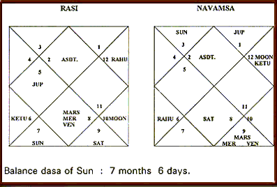 The fourth lord's position in the house of status blessed the native with a good status. His ventures blessed him with short-lived high gains. But impulsive decisions because of combust Mercury, affliction of Venus to the most effective point of the second house and conjunction of Mars to the ascendant spoiled all plans and calculations of the native. The close aspect of the lord of the house of losses, Mars, to the fourth house gave substantial losses through investments in property. Venus affliction to the second house resulted in resigning his official position. The affliction of Jupiter to the Moon posed obstructions in the smooth operations of his enterprises. So, the position of the Sun in the chart did help the native with assets, education, comforts of living, etc., but with disturbances.