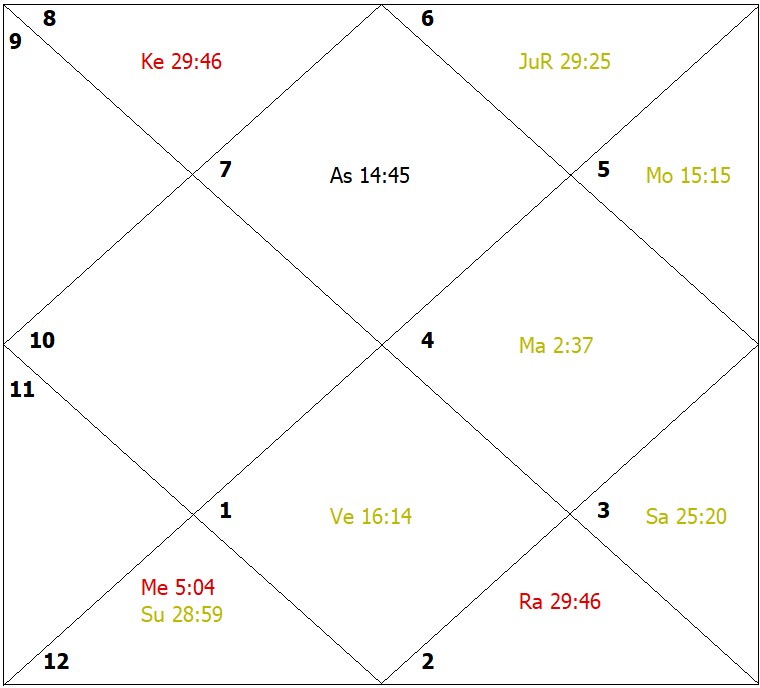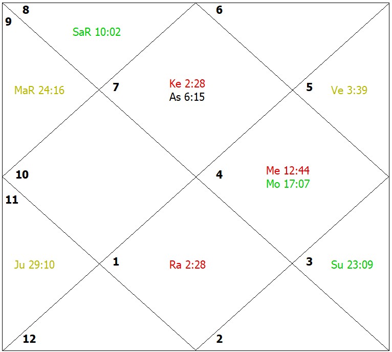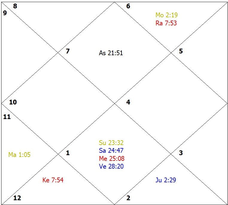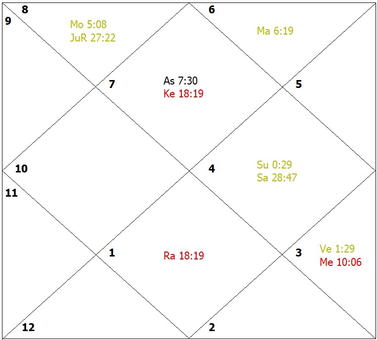 During the sub-period of Mercury in the main period of Saturn, the boy was almost a drunkard. The health was badly affected. The Sun in the second house is aspected by another functional benefic planet, exalted Jupiter, closely. This gave a high status to father, elder sister and promises affluent income to the native. Owing to potentialities in the chart in favorable periods, the bad habits of the native could be controlled. With the astral remedial measures, health also improved remarkably in the sub-period of the Moon in the main period of Saturn.