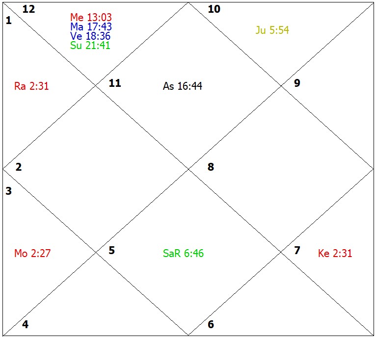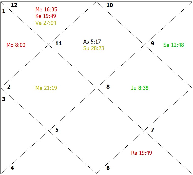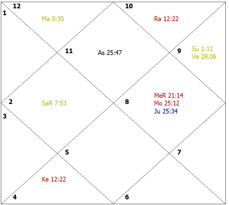 During the sub-period of Rahu in the main period of Jupiter, however, there were obstructions and financial constraints, as Rahu afflicts Mercury ruling inherited wealth and obstructions. The wife of the native keeps indifferent health. Due to the weakness of Mars, though enterprising, the native is lacking activeness. The problems were experienced by the native in the sub-period of Mercury in the main period of Saturn through financial losses. Both Saturn and Mercury are badly placed and heavily afflicted. This period proved quite bad for health of self and spouse and brought financial losses due to litigations. However, due to the powerful placement of Jupiter, the native was impelled to seek the help of divine science and, as a result of that, the ill effects were reduced to a large extent due to sincere performance of astral remedies.