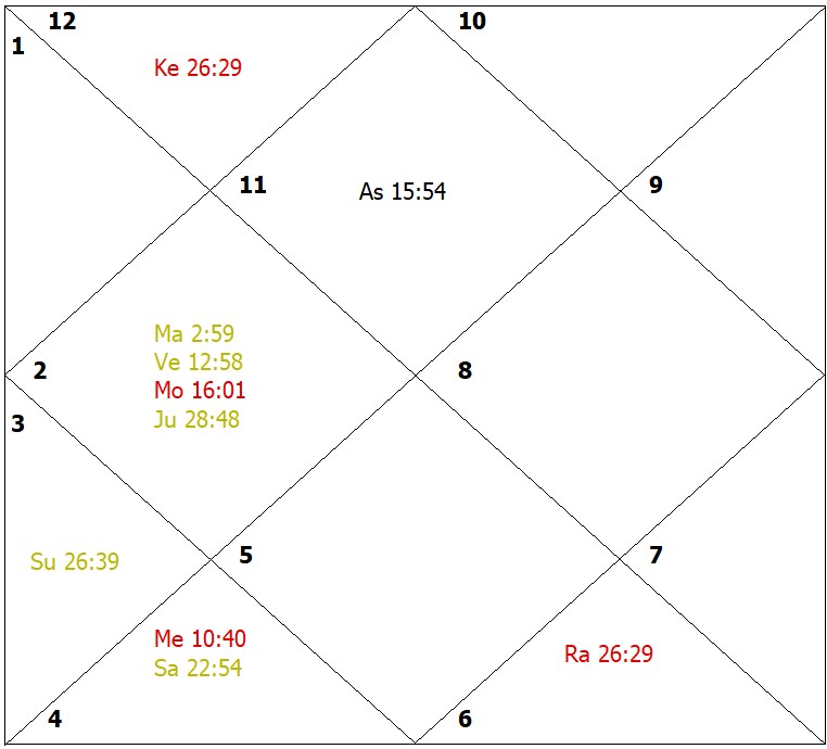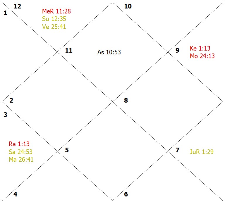 The lords of the ascendant and third house are closely conjunct with each other in the fifth house and are closely afflicted by the functional malefic planet, the Moon. They make the native highly agile and enterprising. Debilitated and combust Mercury is just on the most effective point of the second house indicating obstructions in life. Mercury is closely conjunct with the Sun and has given health problems to wife and setbacks to business partners. Venus occupies the second house in its sign of exaltation. The native was born in a well-to-do family. The lord of the sixth house, the Moon, is in the eleventh house, but quite away from the most effective point. The weak Jupiter in infancy is exactly aspected and afflicted by Rahu. Rahu highly activates the significations of the planets under its influence. Jupiter is placed in the mooltrikona sign of Venus. It gives indication for entering the professions ruled by Venus including the cine world for income. Rahu inflamed the passions and in a very short span of time, the native started producing a Hindi movie. The wife of the native also supported the native in his efforts for rise in status, but the obstructions are caused due to the close conjunction of the functionally malefic debilitated Mercury. This caused nervous pressure. Rahu's close influence on Jupiter gives continuous bad mental health to the son and obstructions to the sources of the income. The movie produced by the native could not be released for being screened for a number of years. The sub-period of Jupiter changed the course of his professional career but could not bless the native with the expected income. The performance of astral remedies helped in reducing the malefic effects of Rahu, Moon and Mercury.