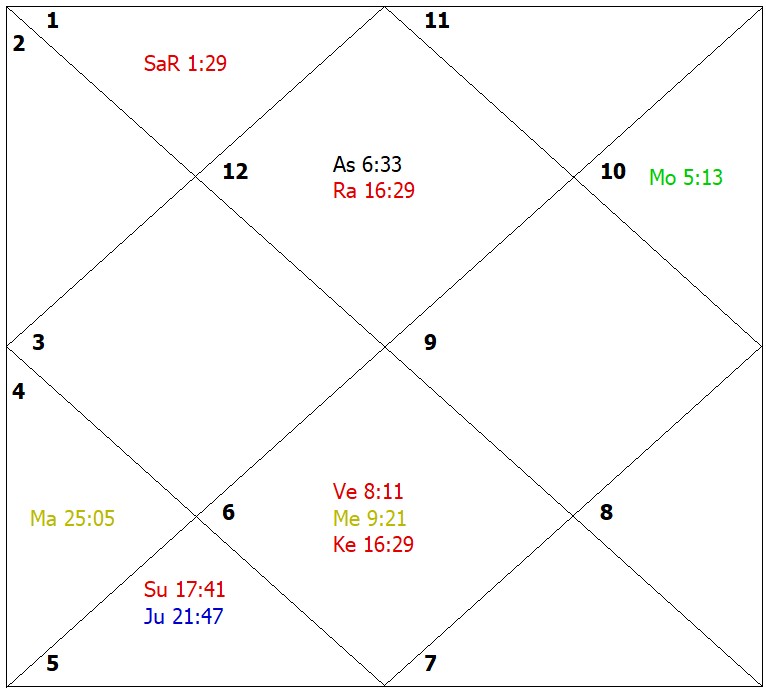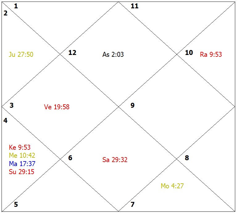 Here, Mercury occupies its sign of exaltation, but is closely conjunct with the most malefic planet Venus, the lord of the eighth house. The significator for the husband, Jupiter, being the tenth lord is combust, in the sixth house and closely afflicted by the sixth lord. This shows that the native lacks the capacity of adjustment and compromise, being basically of an argumentative nature, and has inclination for entering into a dispute, if required. Mars, the lord of the second house ruling family, occupies its sign of debilitation and the functional malefic planet Saturn is placed in the second house. The lord of the house of marital tie, Venus, is weak on account of debilitation, weak dispositor and afflicted most effective point of its house of placement. The lord of the seventh house, Mercury, is weak as it is debilitated in navamsa, exactly afflicted by the most malefic planet and its house of placement/mooltrikona sign is also exactly afflicted. The sign Leo rises in navamsa ascendant and its lord, the Sun, is under the aspect of Ketu.