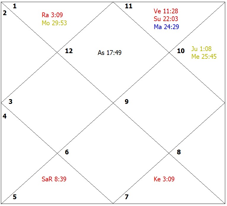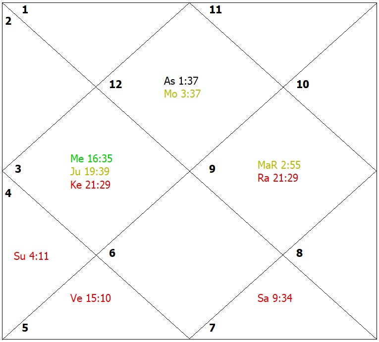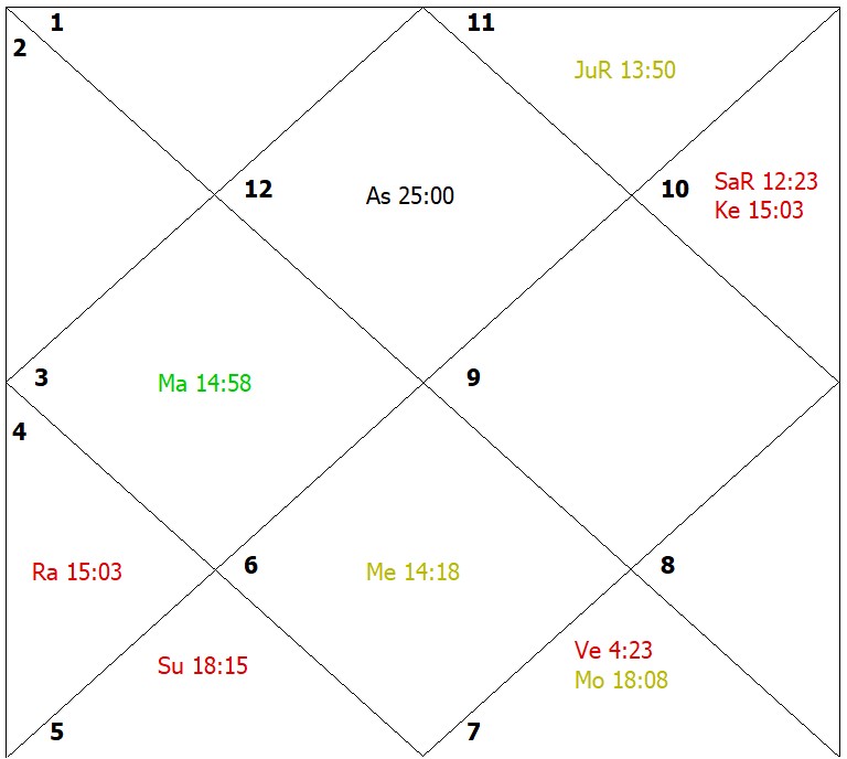 In navamsa, Cancer rises. The ascendant is afflicted by Jupiter. The Moon and Venus are afflicted by Ketu. The seventh lord of the rasi chart, Mercury, being afflicted by Saturn and Rahu, is placed in the eighth house. The marriage took place in the sub-period of Rahu in the main period of Mercury and the inharmonious relationship started immediately after marriage. The divorce proceedings started in the sub-period of Jupiter itself and the divorce was finalised in the sub-period of Saturn.