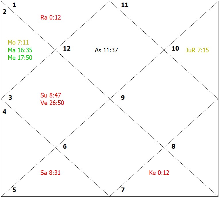 In spite of occupying its sign of exaltation in navamsa, Venus does not derive any strength, due to its debilitation in the main chart. The marriage took place in Rahu-Rahu and differences became disputes in Rahu-Jupiter as Jupiter is placed in the house of disputes. Separation started from Rahu-Saturn.