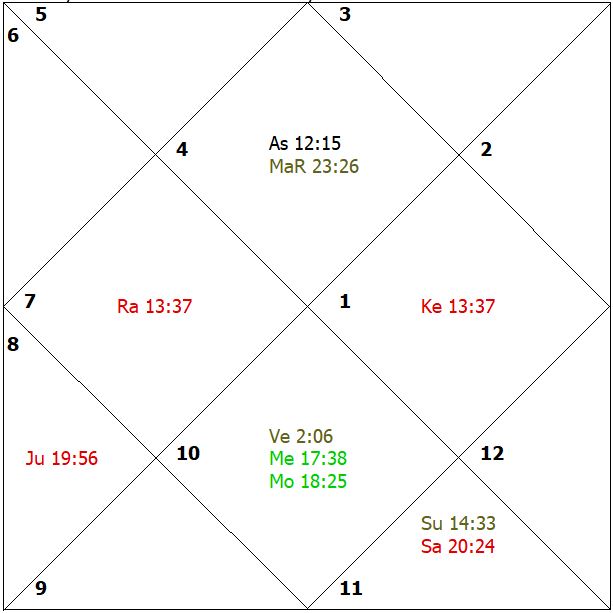 is badly placed. Rahu-Ketu axis closely afflicts Mercury and Venus. Rahu