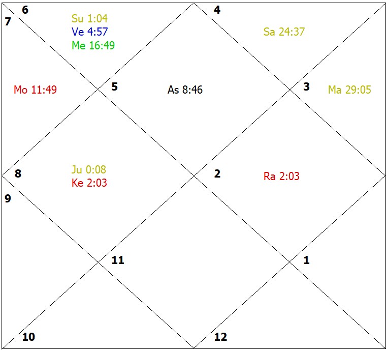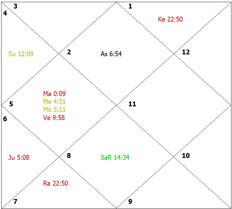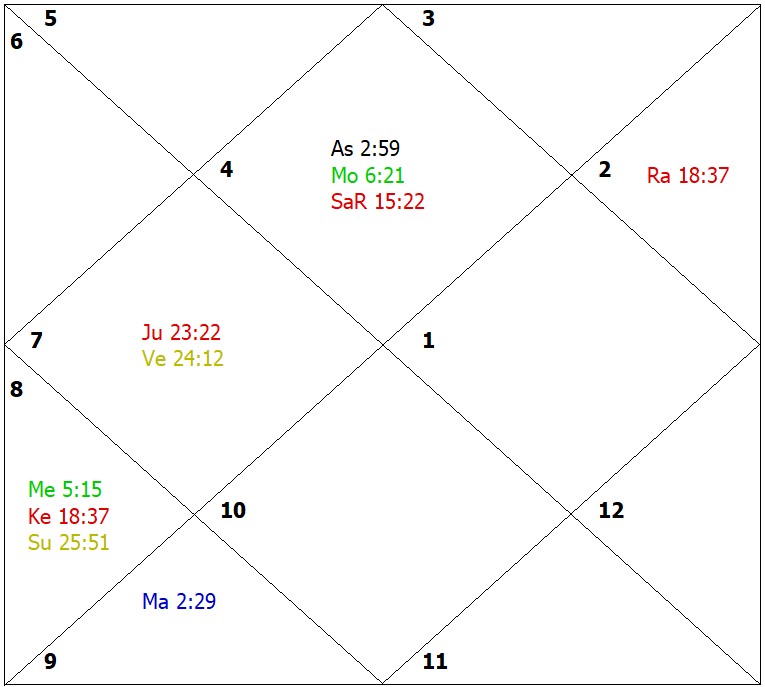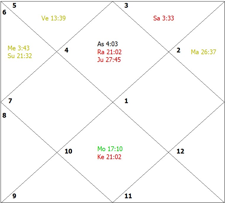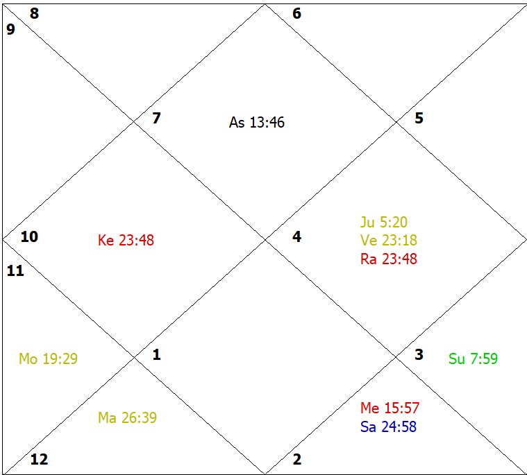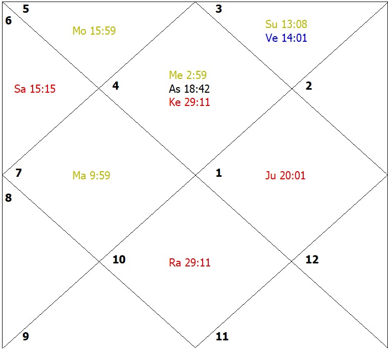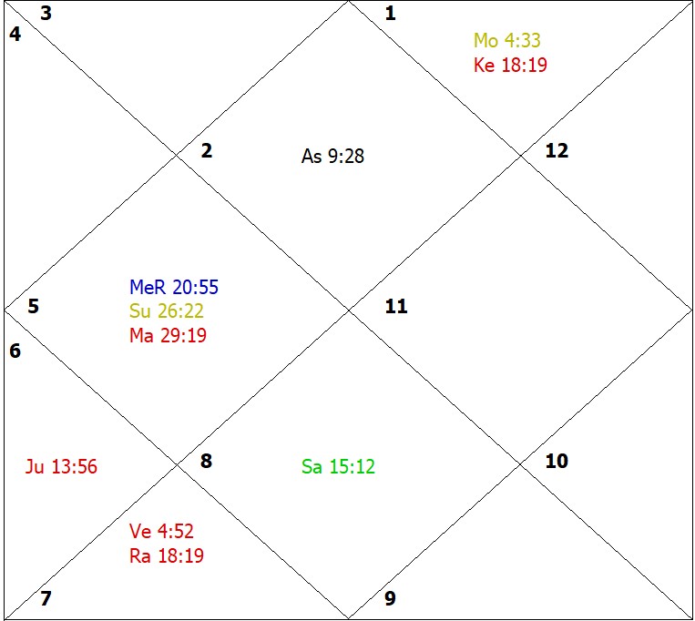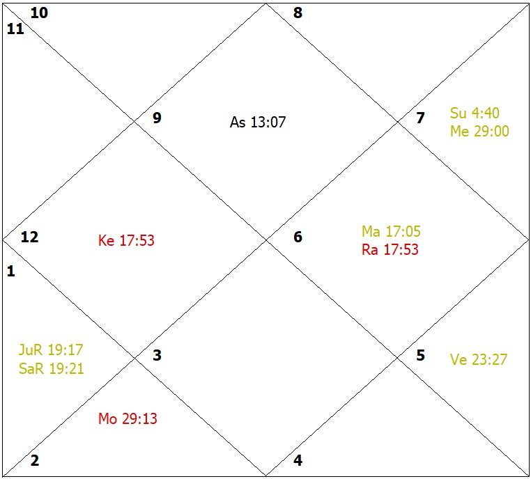 The Sun is well placed in the chart. The lord of the fourth house is placed in the fourth house but closely conjunct with the functional malefic Jupiter. The most malefic planet is placed in the ascendant. This placement of the lord of the eighth house blesses the native with good inheritance but it makes the person prone to accidents. The lord of the ascendant, the Moon, is placed near the most effective point of the ascendant and provides coverage to the afflictions in the chart. Mercury, acting like the Sun and being lord of the third house, is strong in the fifth house. The good placement of the Sun blessed the native with a senior managerial position but the affliction of Venus by functional malefic Jupiter gives tensions. The native suffers from hypertension. There are no close afflictions to the houses and planets signifying professional status. During the sub-period of Rahu in the main period of Venus, the promotion of the native was delayed. At that time, he sought astrological consultation.