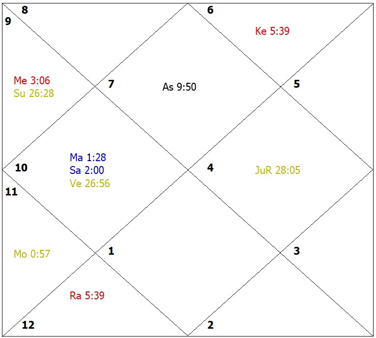 The sign Cancer rises in the ascendant. Mars and the Sun become the prime determinants of professional matters. The sign Pisces rises in the ascendant of dasamsa. No planet is placed in its sign of debilitation in dasamsa. Jupiter, Saturn, Rahu and Ketu act as functional malefic planets. Mercury acts as a Sun-like planet.