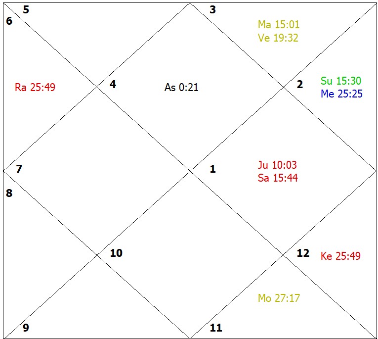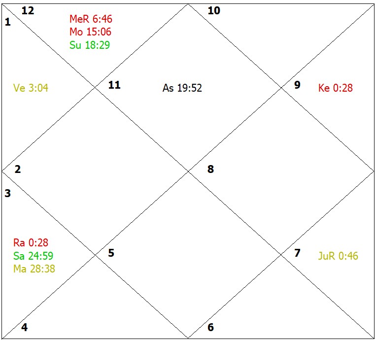 The Moon is well placed in the house of gains in the sign Leo. The Sun has mixed influences as it is well placed, exalted and influences the most effective point of the ascendant closely, but it is also exactly afflicted by the most malefic planet and placed in an afflicted house. Jupiter acting like the Sun closely influences the most effective points of the tenth and second houses. Besides being in infancy, Venus is also weak due to its mooltrikona house and its house of placement being exactly afflicted by the most malefic planet, Mercury. Saturn is weak due to infancy. Mercury exactly afflicts the Sun and makes the person vulnerable to losses both on financial and professional front. The close influence of the Sun on the ascendant and of Jupiter on the second and tenth houses conferred a good executive status with the government. Rahu and Ketu do not form close afflictions in this nativity.