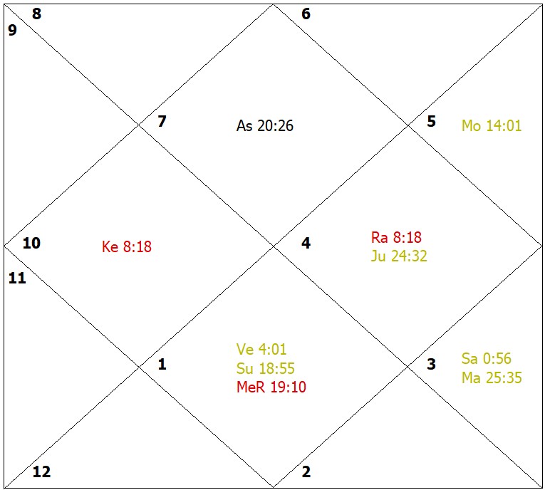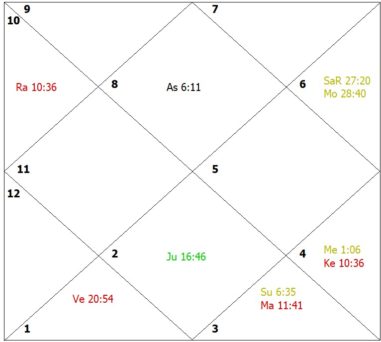 Coming from an ordinary family, the native could acquire the position of the Director of a large corporate house owned by the Government due to the close influence of the Sun on the second house. However, the placement of the functional malefic planets in the second house and severe affliction of Rahu to the weak Jupiter posed difficulties to the native from time to time in the sub-periods of the afflicting planets. When the Sun is strong, things remain manageable. The native sought astral remedies to reduce the impact of the afflictions in the chart.