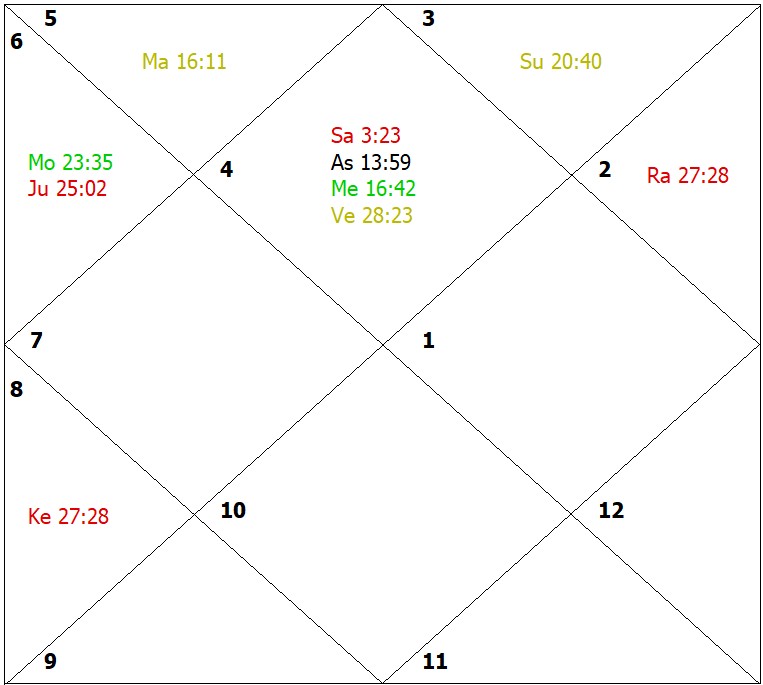 The sign Virgo rises in the ascendant. The lord of the second house, Venus, becomes the prime determinant of professional matters as there is no mooltrikona sign in the tenth house. Cancer rises in the ascendant of dasamsa and the Moon becomes the additional prime determinant of professional matters. Saturn and Jupiter are in their signs of debilitation in dasamsa. Mars is secondary determinant of professional matters. Saturn, Mars, the Sun, Rahu and Ketu act as functional malefic planets. Venus acts as a Sun-like planet in this case.