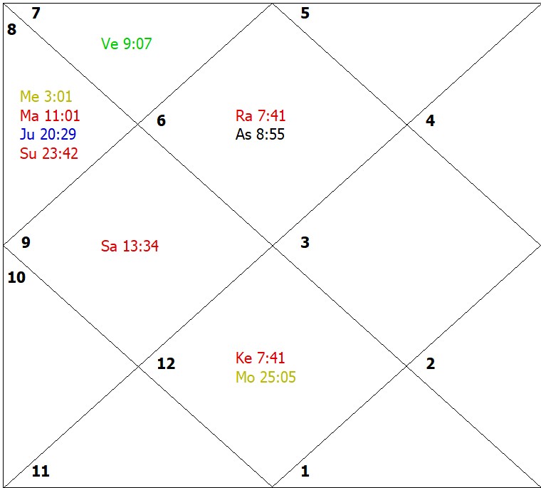 Saturn is strong in the fifth house, linking status with professional background, and is closely associated with the lord of the third house, Mars. The Sun is strong in the second house, ruling status, close to the most effective point of the house. Mars is weak due to old age. Venus is well placed in the house of initiatives but is weak due to infancy and weakness of dispositor. Venus is closely under the afflicting aspect of Ketu. Jupiter is weak due to utter infancy and is exactly under the afflicting aspect of Rahu. The functional malefic planets, the Moon and Mercury, are placed in the second house but are away from the most effective point. Mercury is weak due to combustion and debilitation.