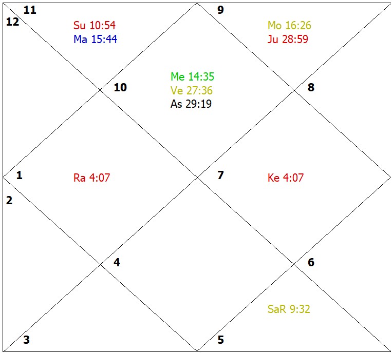The sign Libra rises in the ascendant. The Moon becomes the prime determinant of professional matters. Aries rises in dasamsa and its lord, Mars, becomes the additional prime determinant of professional matters. The Sun is in its sign of debilitation in dasamsa. Jupiter becomes secondary determinant of professional matters. Mercury, Rahu and Ketu act as functional malefic planets. Jupiter acts as a Sun-like planet in this case.