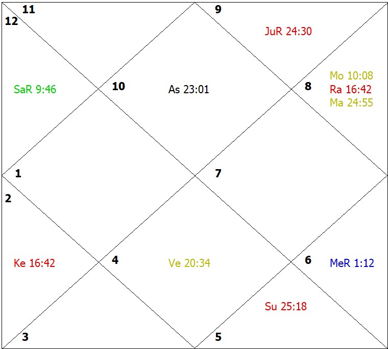 The sign Scorpio rises in the ascendant. The Sun and Jupiter are the prime determinants of professional matters in this case. Aquarius rises in the ascendant of dasamsa and Saturn becomes the additional prime determinant of professional matters. No planet is in its sign of debilitation in dasamsa. Mars, Venus, Rahu and Ketu act as functional malefic planets. The Moon and Jupiter act as Sun-like planets.